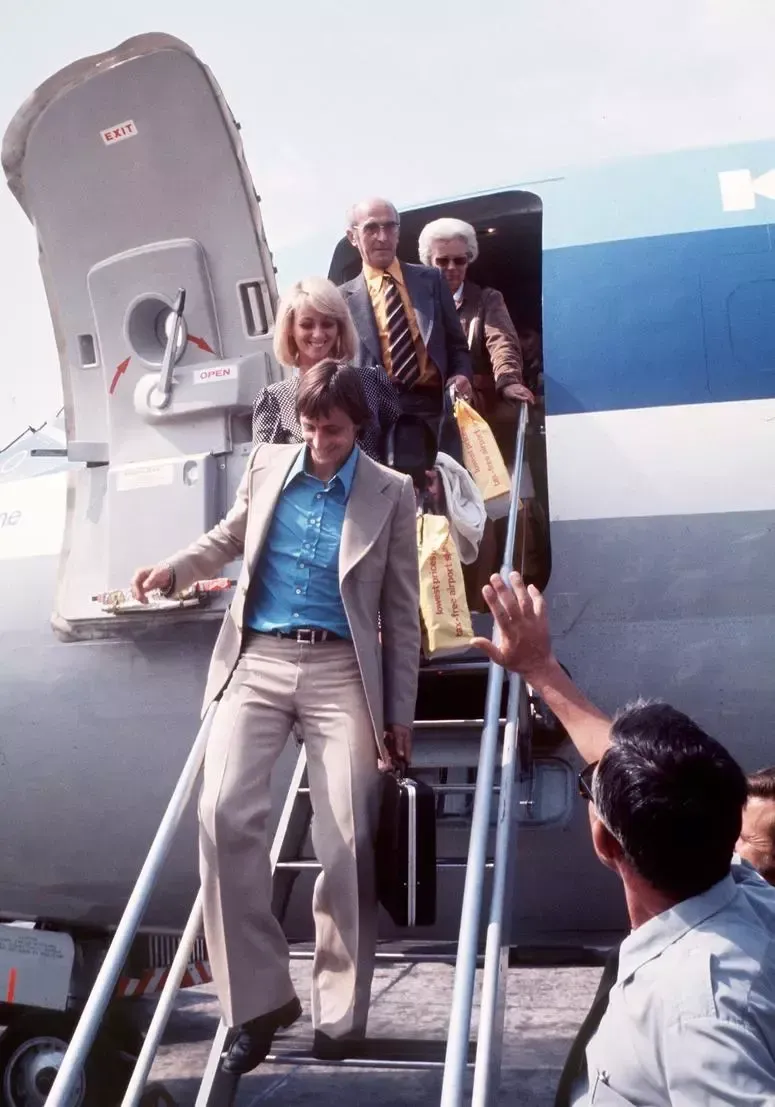 Johan Cruyff i la seva esposa Danny arribant a Barcelona el 1973